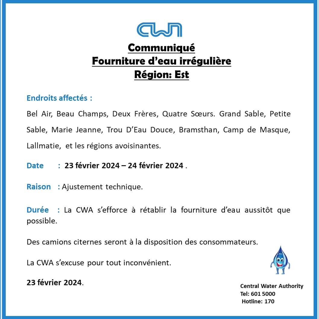 Due to some technical adjustments by the Central Water Authority (CWA), water supply has been irregular in the eastern region of the island since Friday, February 23rd. Several villages, including Bel-Air, Beau-Champs, Deux-frères, Quatre-Soeurs, Grand-Sable, Petit-Sable, Marie-Jeanne, Trou-d’eau-Douce, Bramsthan, among others, are affected.