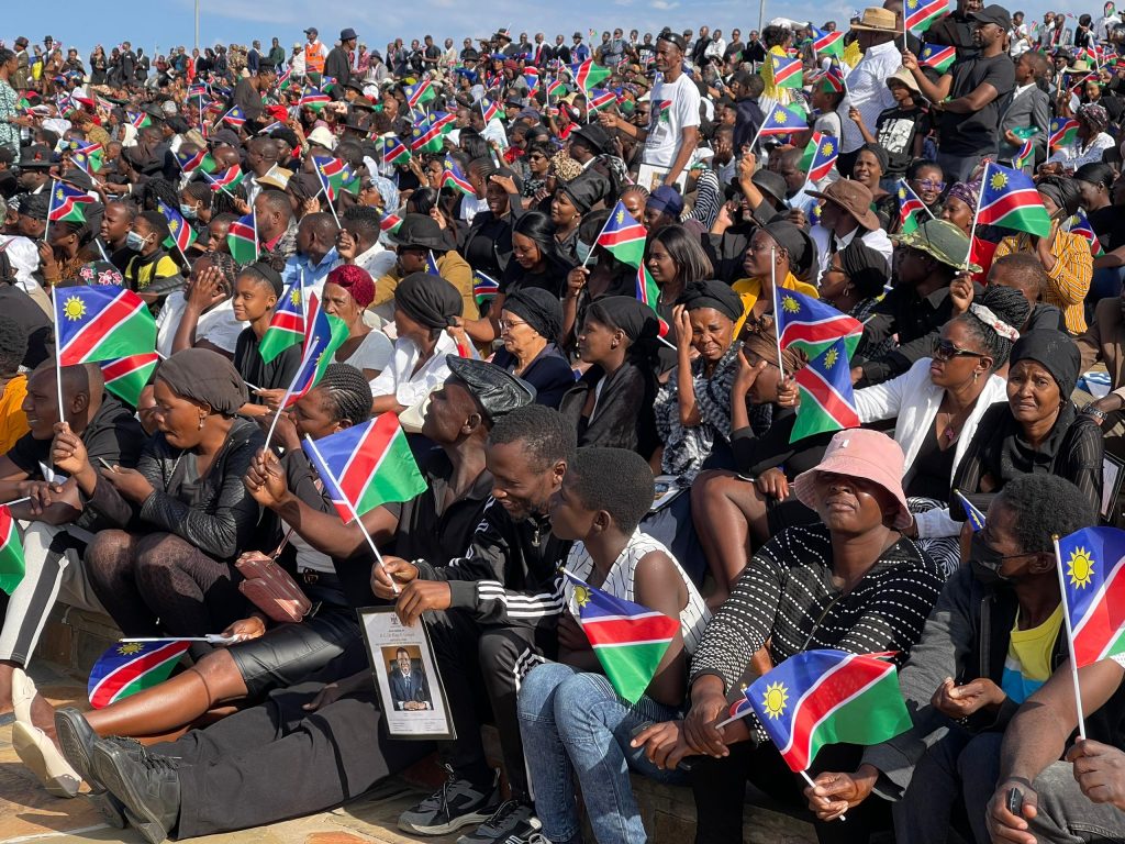 Deputy Prime Minister John Mutorwa and other high-ranking government officials, as well as African Union Commission Chairperson Moussa Faki Mahamat and Minister in the Presidency Christine //Hoebes, have gathered at Heroes’ Acre for the funeral. The ceremony, scheduled to begin at 10:00 on Sunday, has Chief Justice Peter Shivute and Prime Minister Saara Kuugongelwa-Amadhila in attendance.