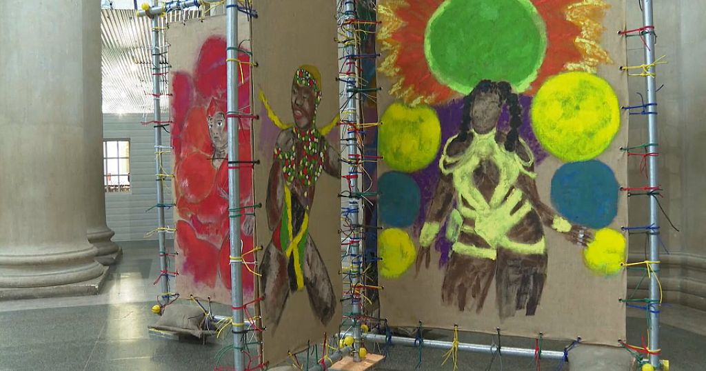 A silver painted dancer figure greets audiences in the centre of Tate Britain’s galleries, adorned with fabrics and jewellery.